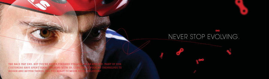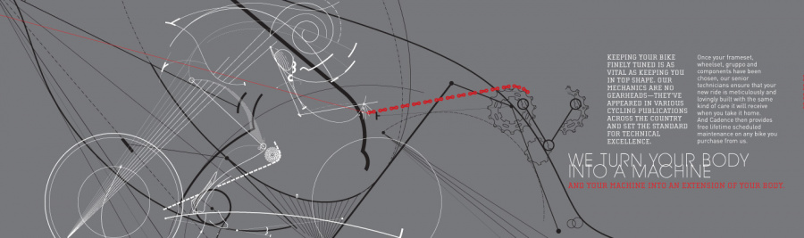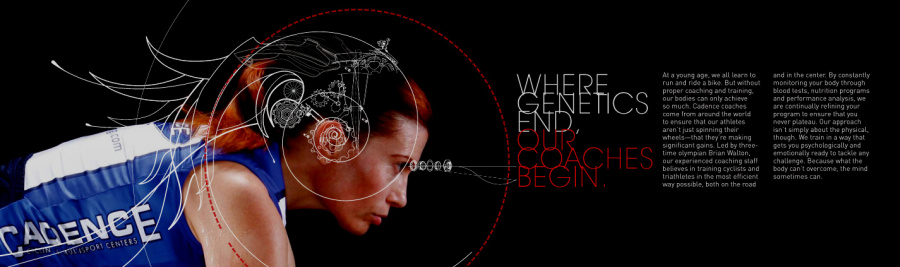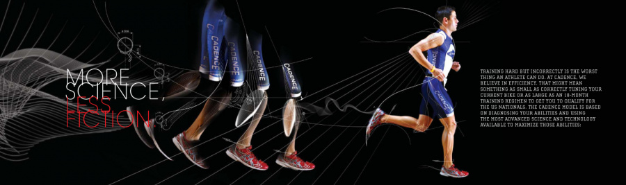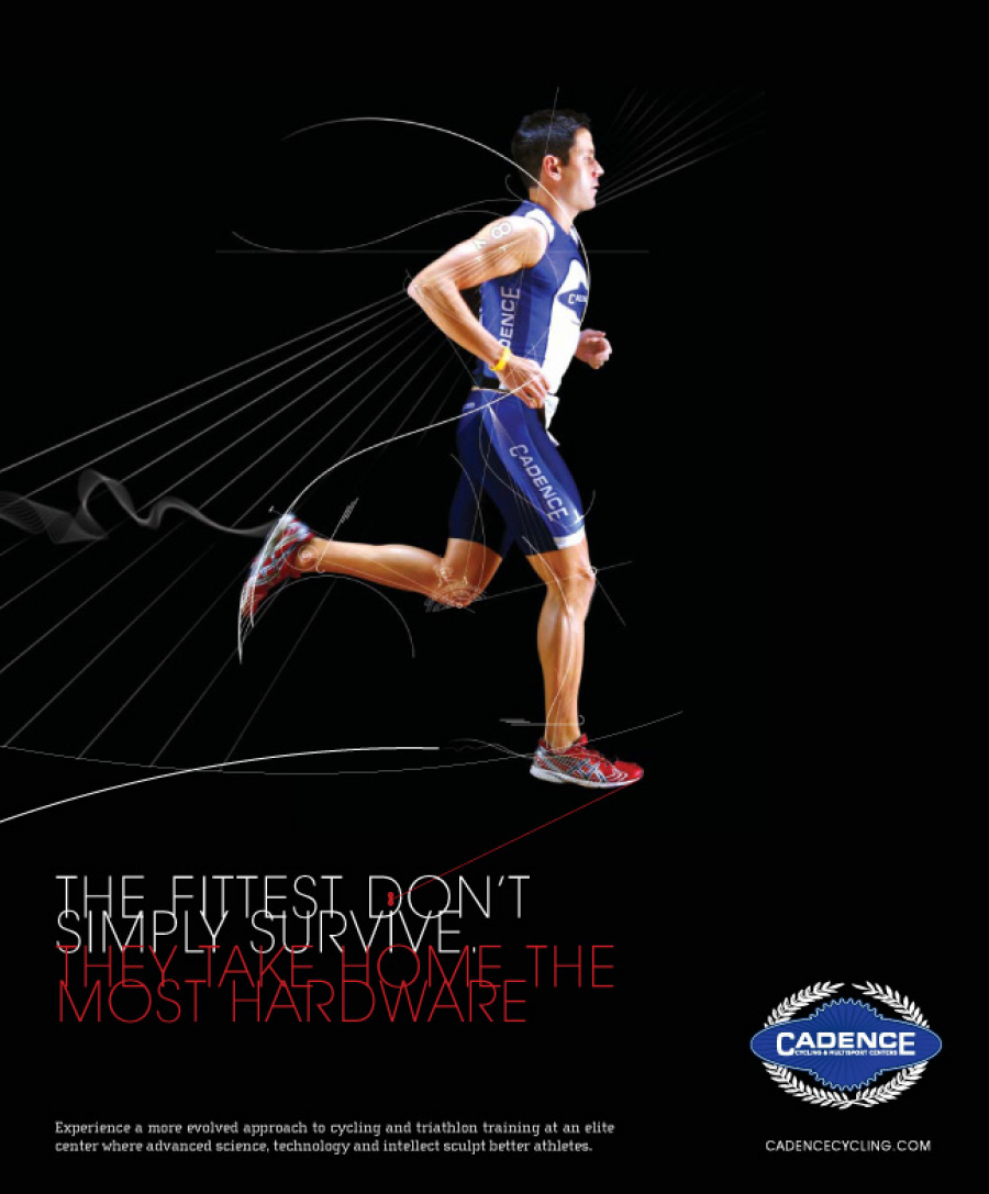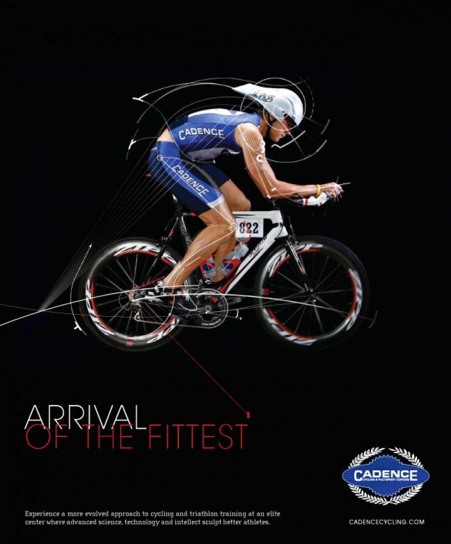Cadence Cycling is not your typical cycle shop. While super road bicycles and apparel are the priority, Cadence focuses on making you the perfect athlete. With training and testing onsite, your dreams of stepping up from a weekend warrior to a full on triathlete are mere feet away. The triathlete is a special kind of User. They study a lot of technique, and precise movements. They know their body down to the centimeter, and how it reacts to certain products and conditions. The line between sports and science, blurs. So in the approach for this campaign, it was about bringing this thinking to light. The evolution of man from nature and into a powerful, precise machine. The linework revolved specifically from the photos of actual Cadence trained triathletes, who helped guide how the forms should emit from each pose. Natural curvature and alignments brought to the forefront to emphasize mechanics. SCIENCE!