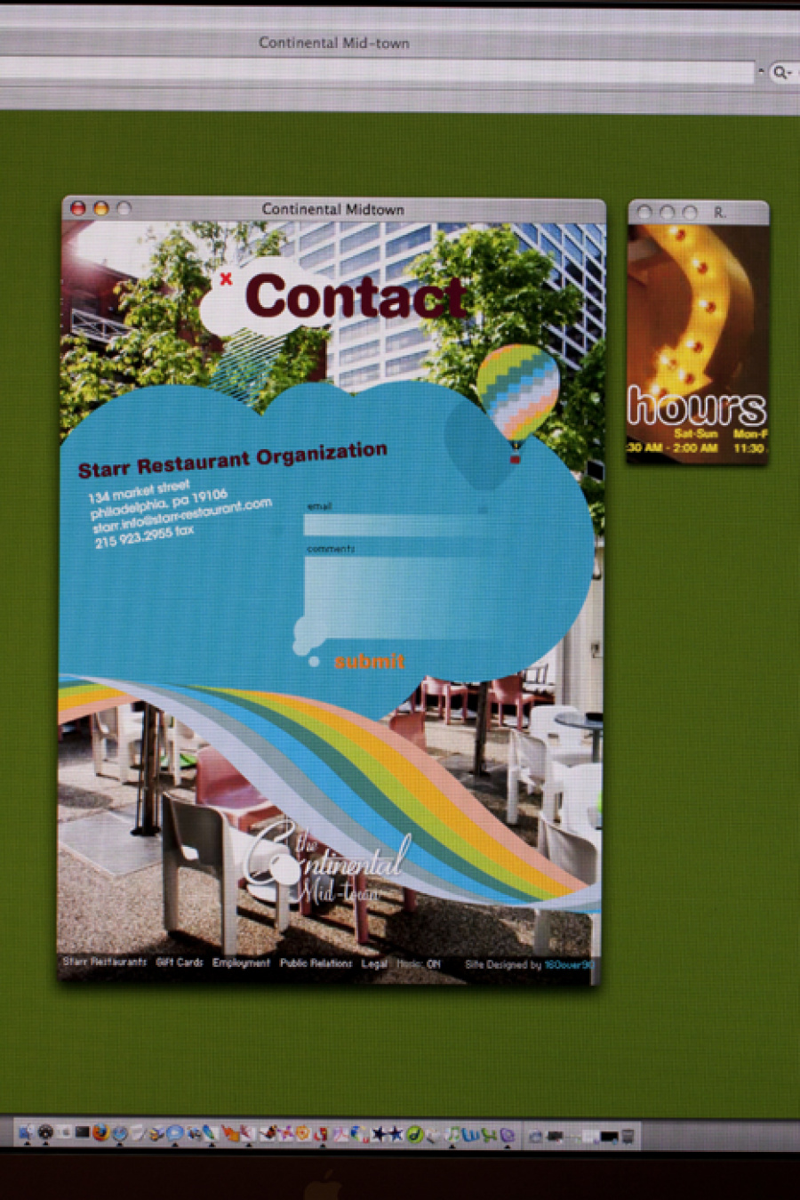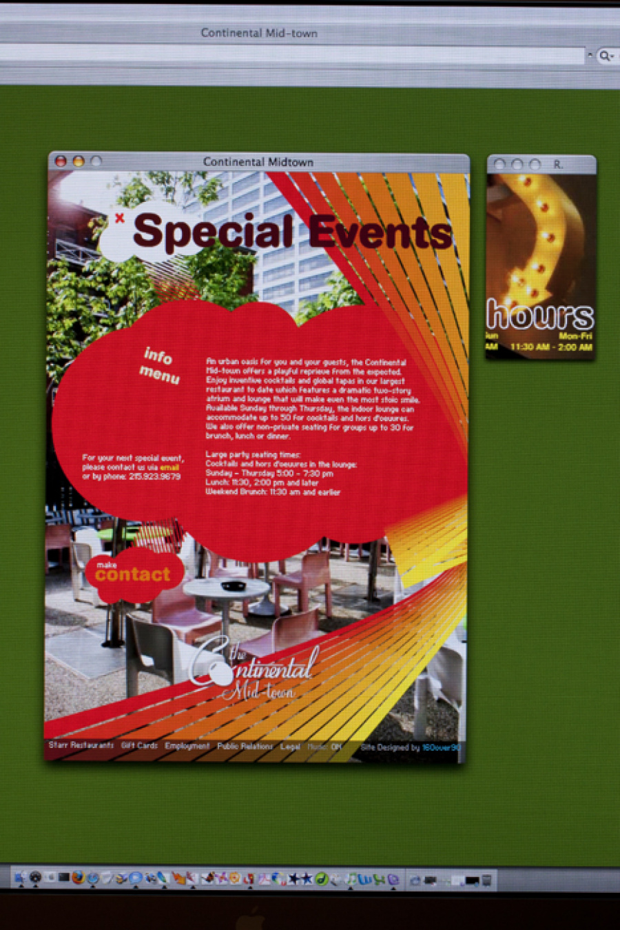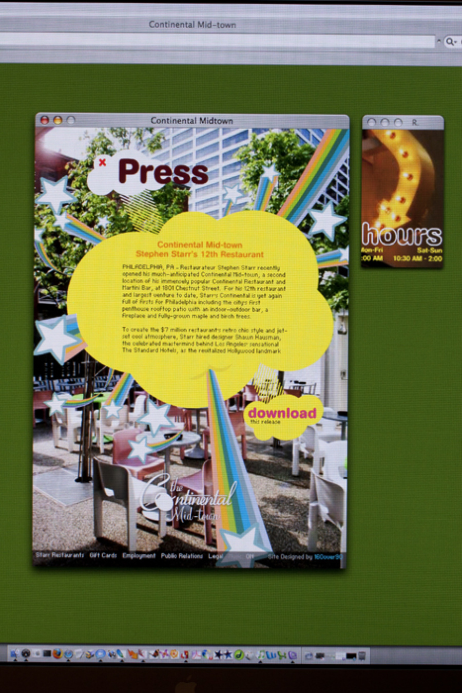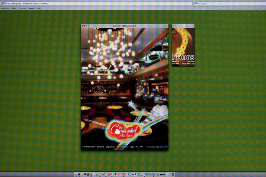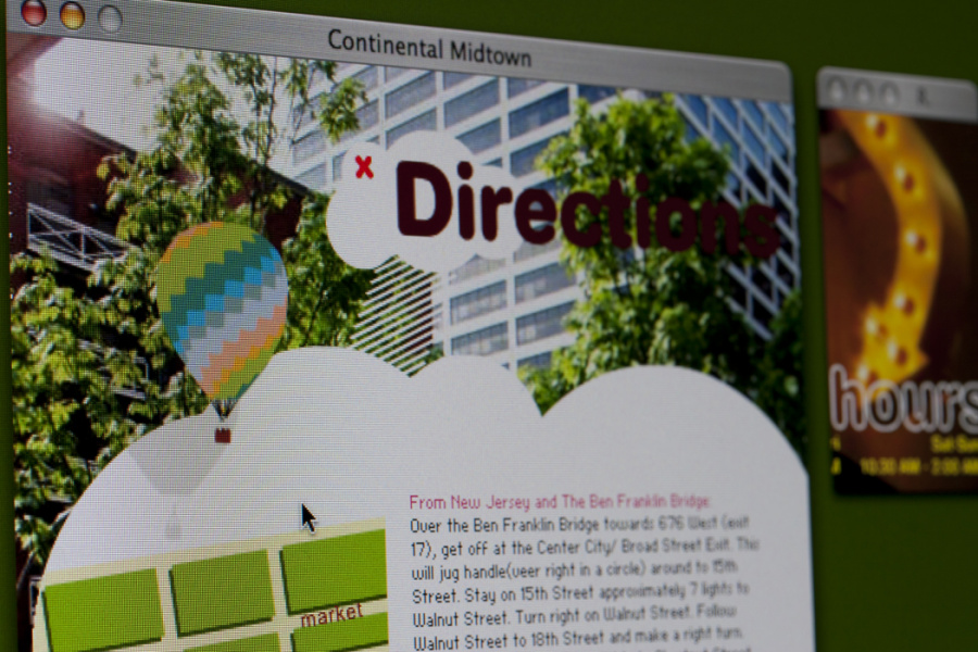The more work I add to this site, the more I realize how dated my digital work gets. Not so much the print stuff, just digital. Why is that? Shouldn’t design be timeless? I’ll chock it up to technological constraints. Why not. Regardless, this flash site utilized positioned popup windows for a cheeky user engagement. Since pop ups at the time were more “SURPRISE!” than spyware, it seemed like a relatively good idea. Plus passing variables from a flash movie in one window to flash movies in another was blowing our minds. Oh how times have changed. Oddly enough, the site is still active, check it out at continentalmidtown.com.