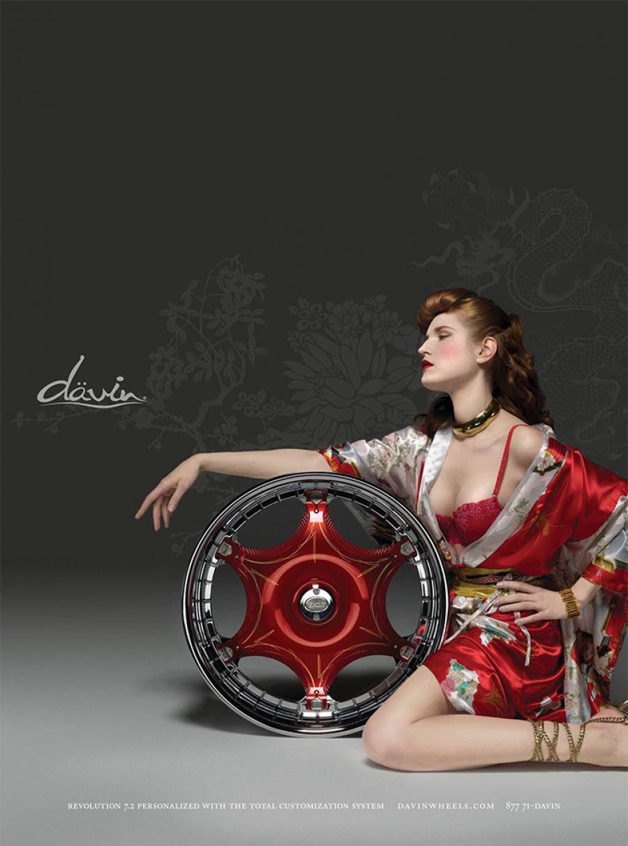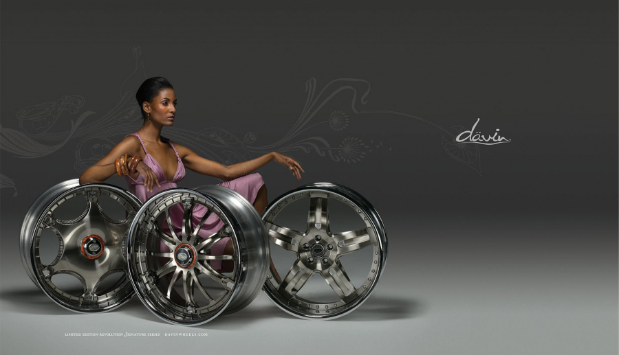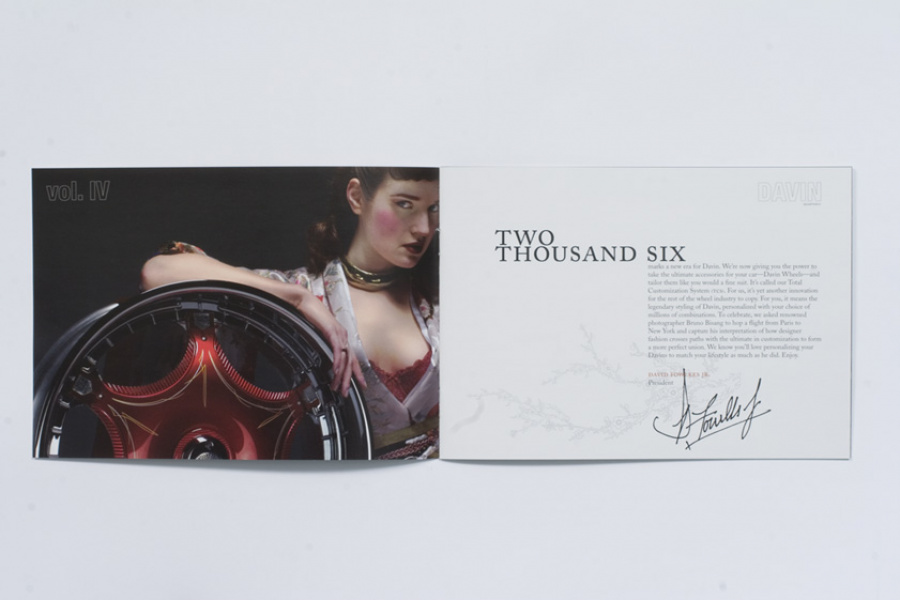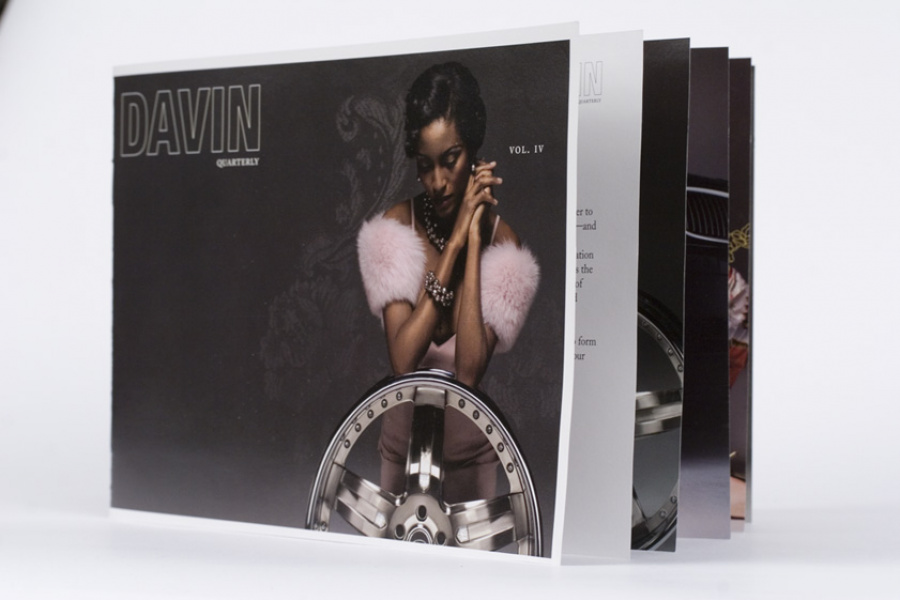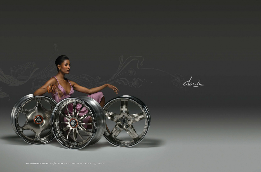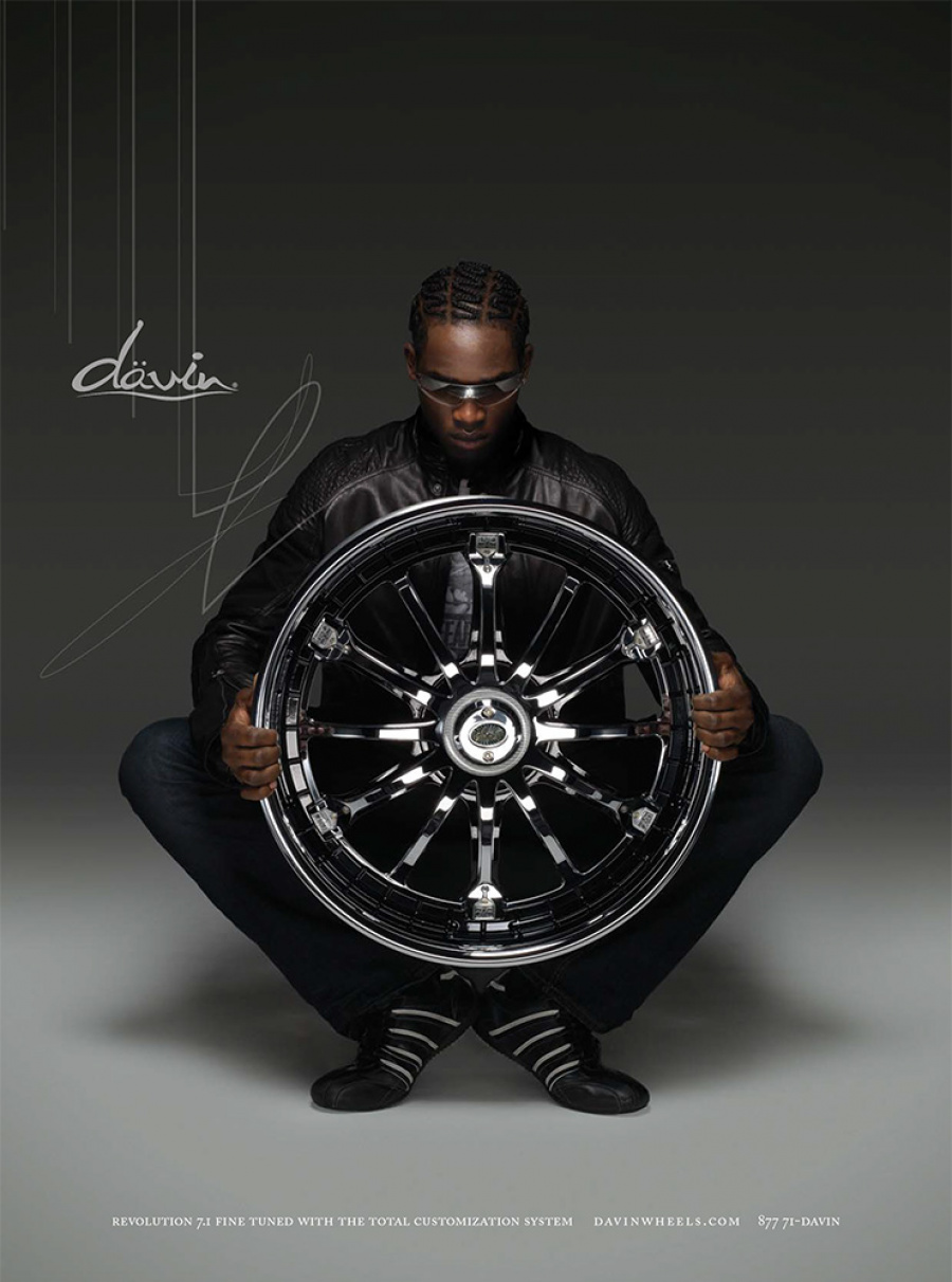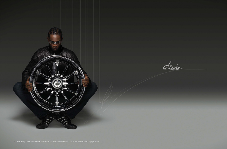Couture for the highway versus the runway. Today, Davin Wheels are considered the ultimate personal statement for your luxury automobile. But in 2001, the company came to 160over90 with little more than a business plan and an innovation: the spinning rim. In a market dominated by bikini babes draped around exhaust manifolds, we took the high road, elevating Davin to the category equivalent of Bentley, Cartier, or Vuitton. Media hits and sales skyrocketed, garnering write-ups in Maxim, Time, and GQ while becoming the de rigeur accessory for celebrities like Nelly, Martin Lawrence, and Shawquille O’Neal. Like any of the top fashion houses, Davin introduces an entirely new line once a year, prompting an annual brand overhaul. In 2006 Davin released the Total Customization System, giving clients the ability to match their wheels to anything from their jewelry to their eye color. To capture Davin as the ultimate accessory for you and your vehicle, the agency hired renowned French fashion photographer Bruno Bisang to help launch Davin Quarterly, a magalog publication targeted to Davin enthusiasts worldwide. Davin’s customization option launched with immediate success, and the resulting campaign helped sell out their limited edition Signature Series mere weeks after its debut.