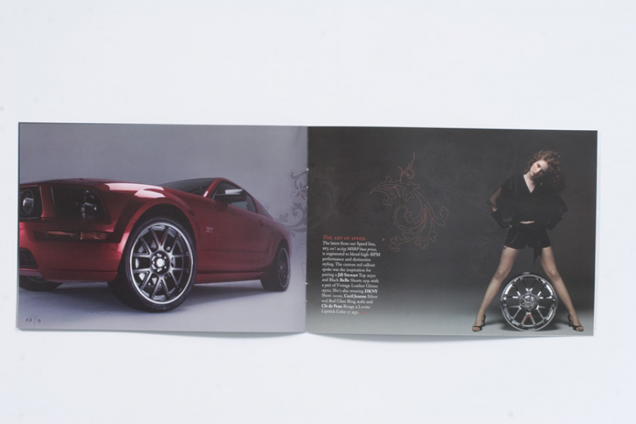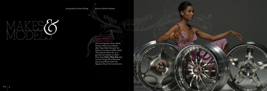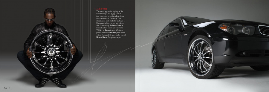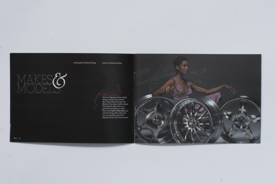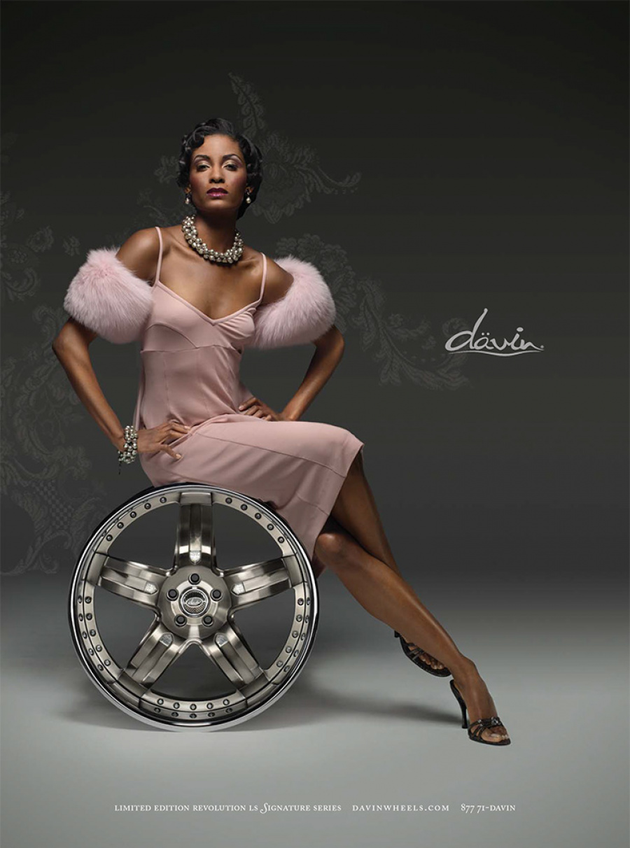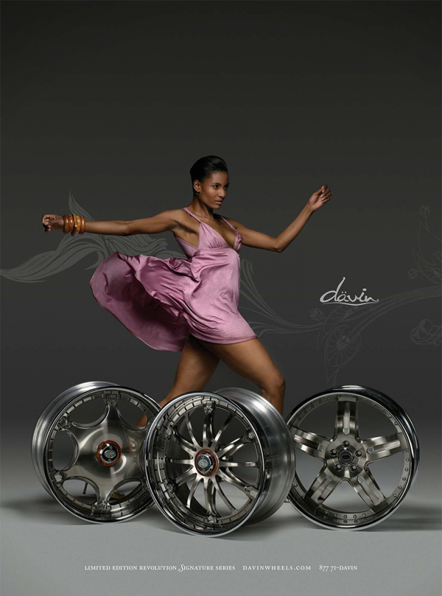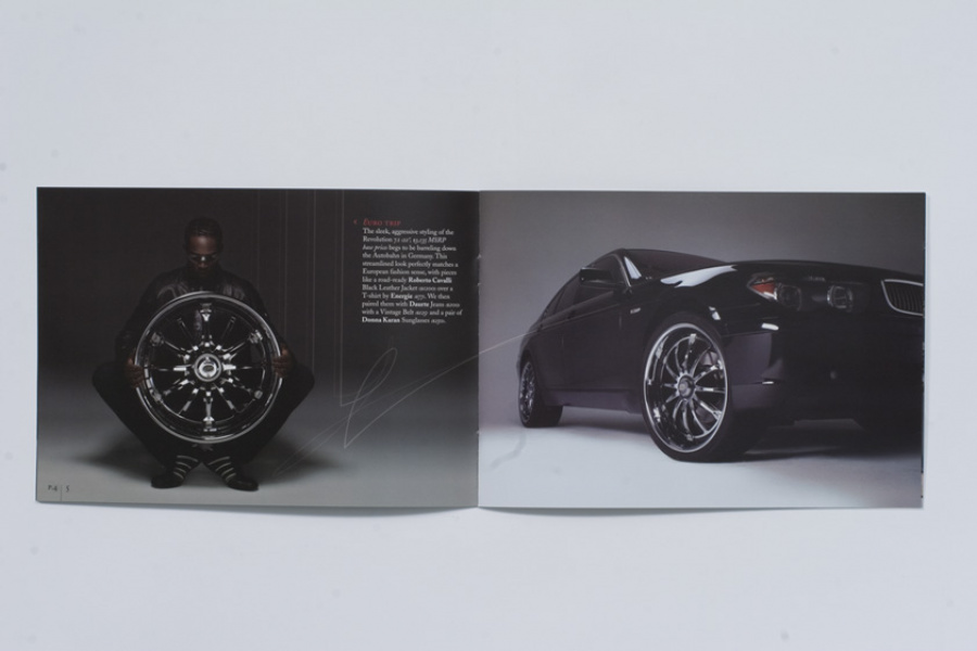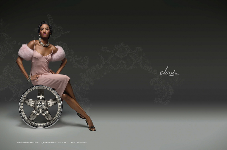 Couture for the highway versus the runway. Today, Davin Wheels are considered the ultimate personal statement for your luxury automobile. But in 2001, the company came to 160over90 with little more than a business plan and an innovation: the spinning rim. In a market dominated by bikini babes draped around exhaust manifolds, we took the high road, elevating Davin to the category equivalent of Bentley, Cartier, or Vuitton. Media hits and sales skyrocketed, garnering write-ups in Maxim, Time, and GQ while becoming the de rigeur accessory for celebrities like Nelly, Martin Lawrence, and Shawquille O’Neal. Like any of the top fashion houses, Davin introduces an entirely new line once a year, prompting an annual brand overhaul. In 2006 Davin released the Total Customization System, giving clients the ability to match their wheels to anything from their jewelry to their eye color. To capture Davin as the ultimate accessory for you and your vehicle, the agency hired renowned French fashion photographer Bruno Bisang to help launch Davin Quarterly, a magalog publication targeted to Davin enthusiasts worldwide. Davin’s customization option launched with immediate success, and the resulting campaign helped sell out their limited edition Signature Series mere weeks after its debut.
