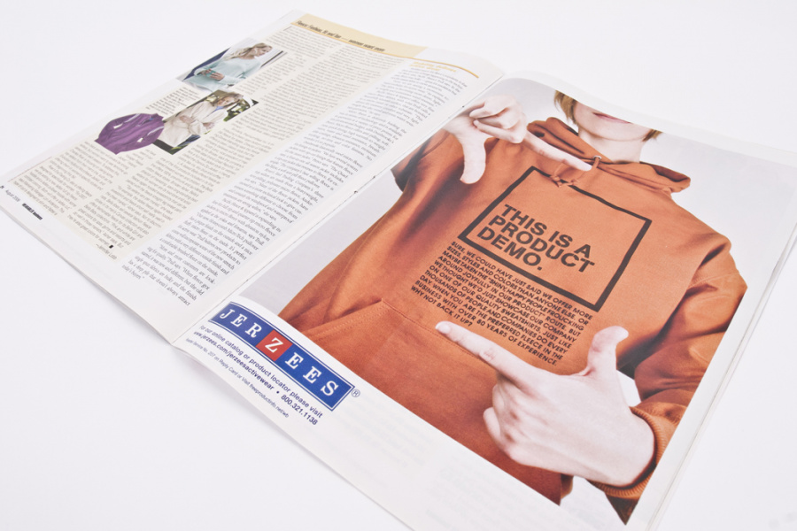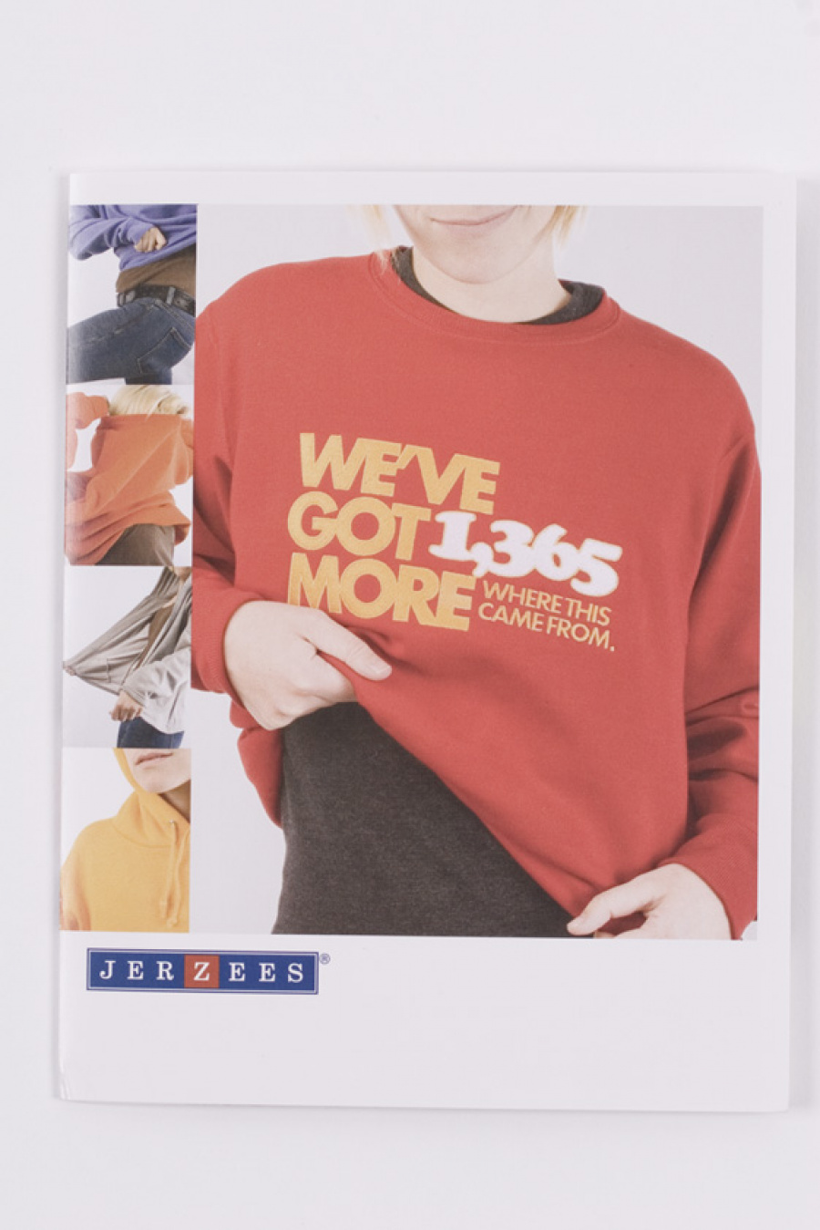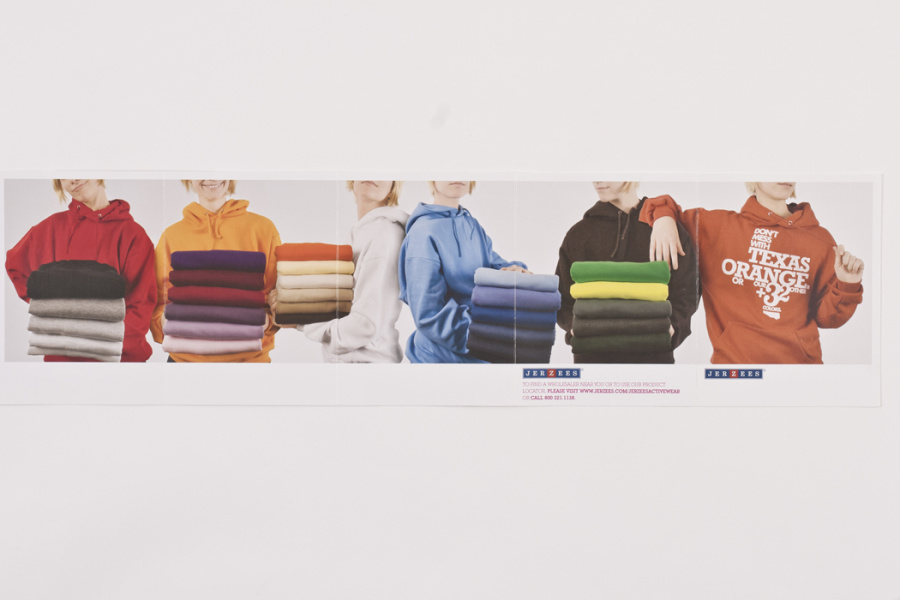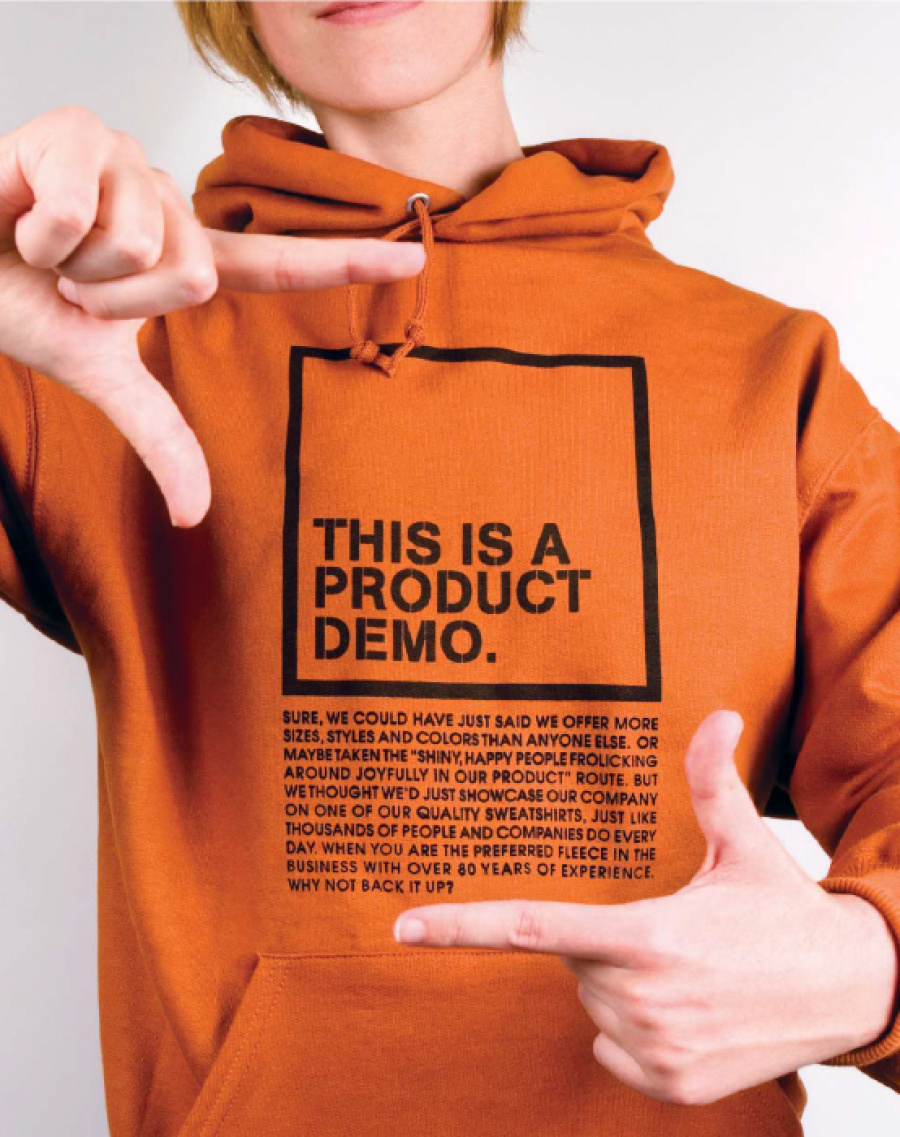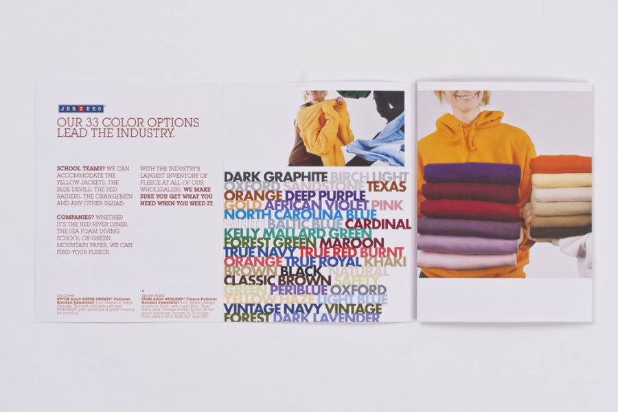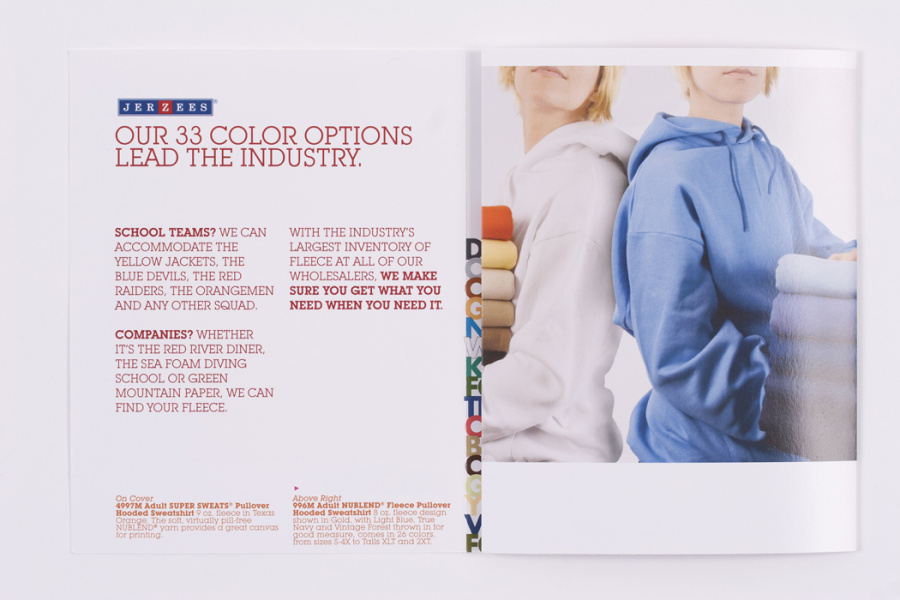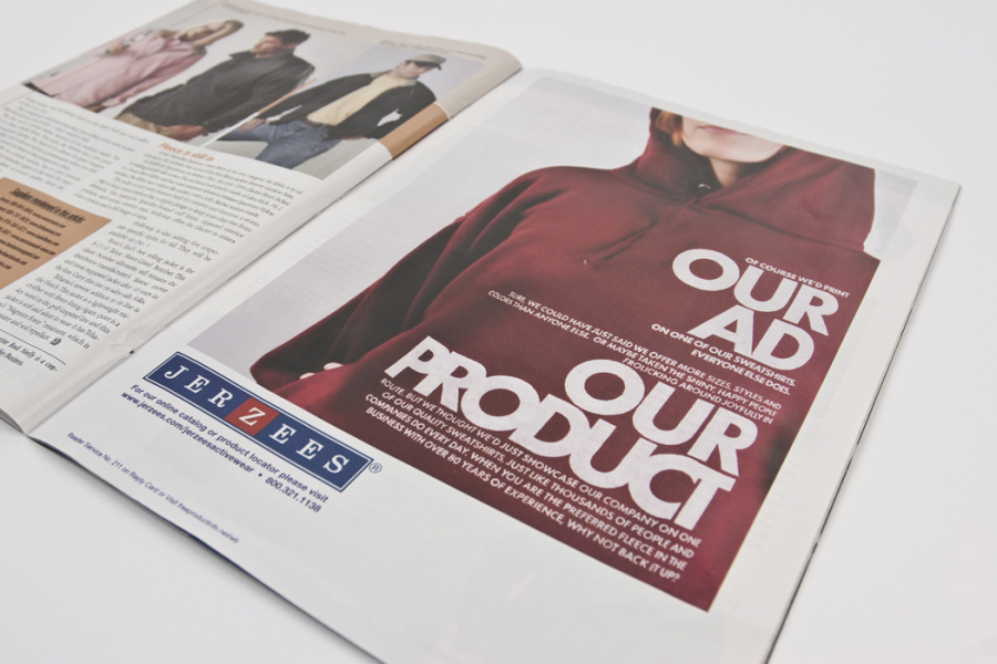 Because Jerzees is the market leader in offering the most sizes, styles and colors, it was important that our campaign concept clearly convey these message points to embellishers, but in a way that would stand out among competing brands. After exploring several different concepts, we realized that sometimes the most effective way to show what a product does is to show exactly what the product does. We recognized that the main way that decorators use Jerzees fleece is to print companies’, teams’ and peoples’ logos on them—essentially advertising these brands. Therefore, our concept achieves the same results by literally printing our messaging on a Jerzees fleece that someone is wearing. Each execution highlights the main benefits of Jerzees products (the industry’s most sizes, styles and colors) while showing how well people can print on the product. It’s a bold, unique, overt way to show decorators and distributors what separates Jerzees from other companies.