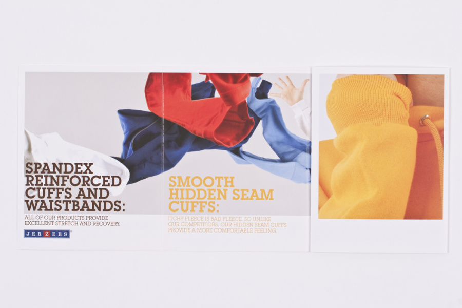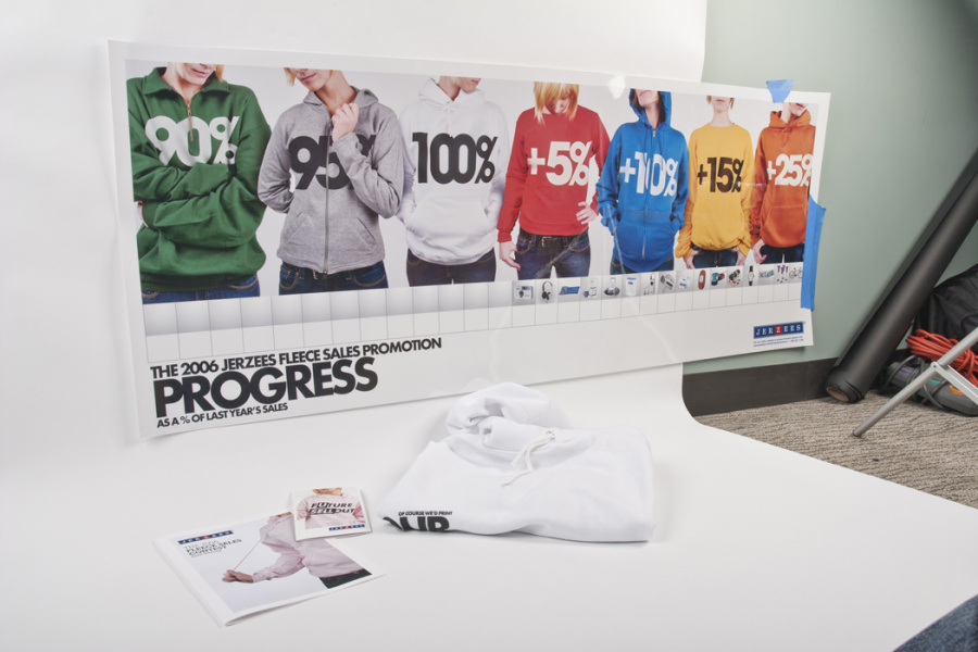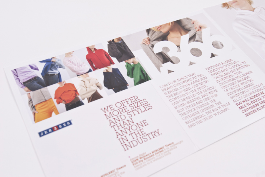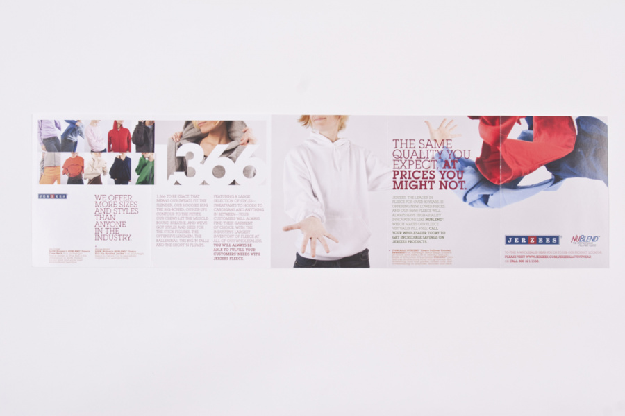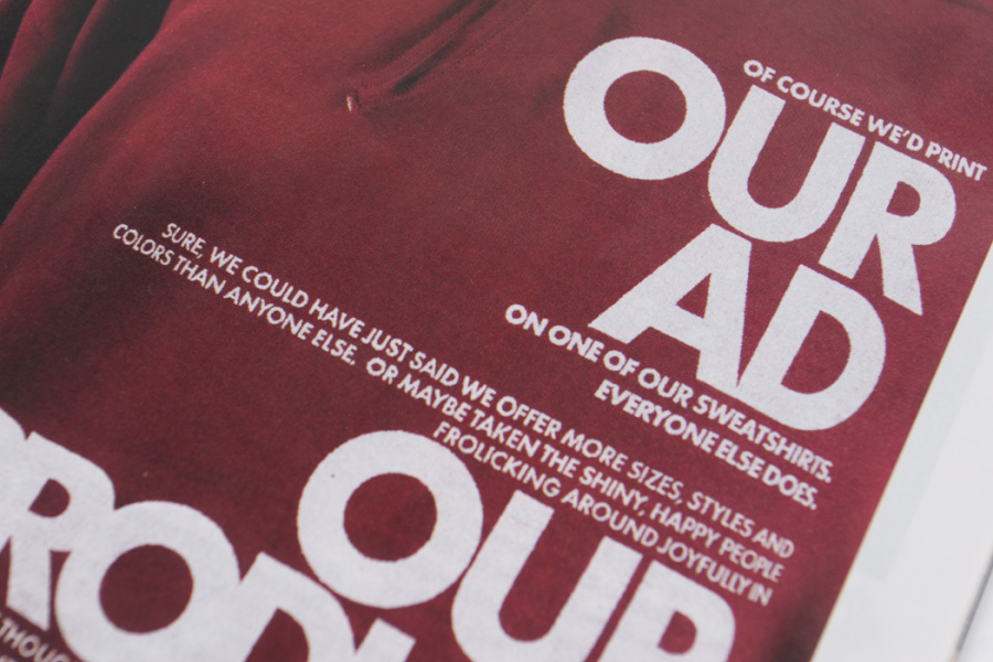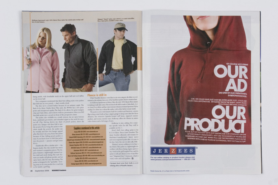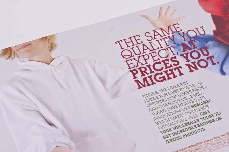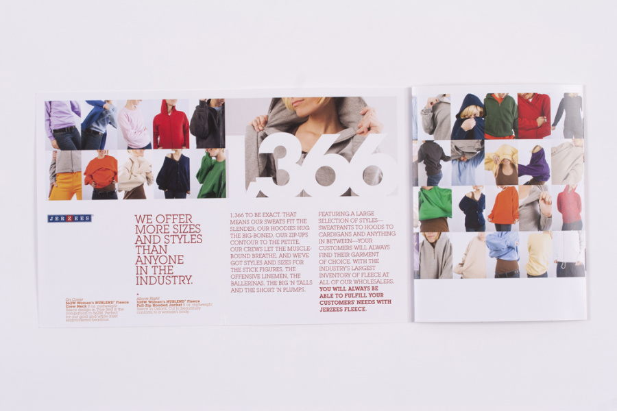 Because Jerzees is the market leader in offering the most sizes, styles and colors, it was important that our campaign concept clearly convey these message points to embellishers, but in a way that would stand out among competing brands. After exploring several different concepts, we realized that sometimes the most effective way to show what a product does is to show exactly what the product does. We recognized that the main way that decorators use Jerzees fleece is to print companies’, teams’ and peoples’ logos on them—essentially advertising these brands. Therefore, our concept achieves the same results by literally printing our messaging on a Jerzees fleece that someone is wearing. Each execution highlights the main benefits of Jerzees products (the industry’s most sizes, styles and colors) while showing how well people can print on the product. It’s a bold, unique, overt way to show decorators and distributors what separates Jerzees from other companies.
