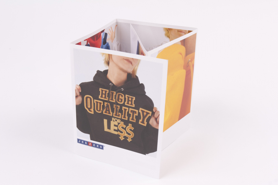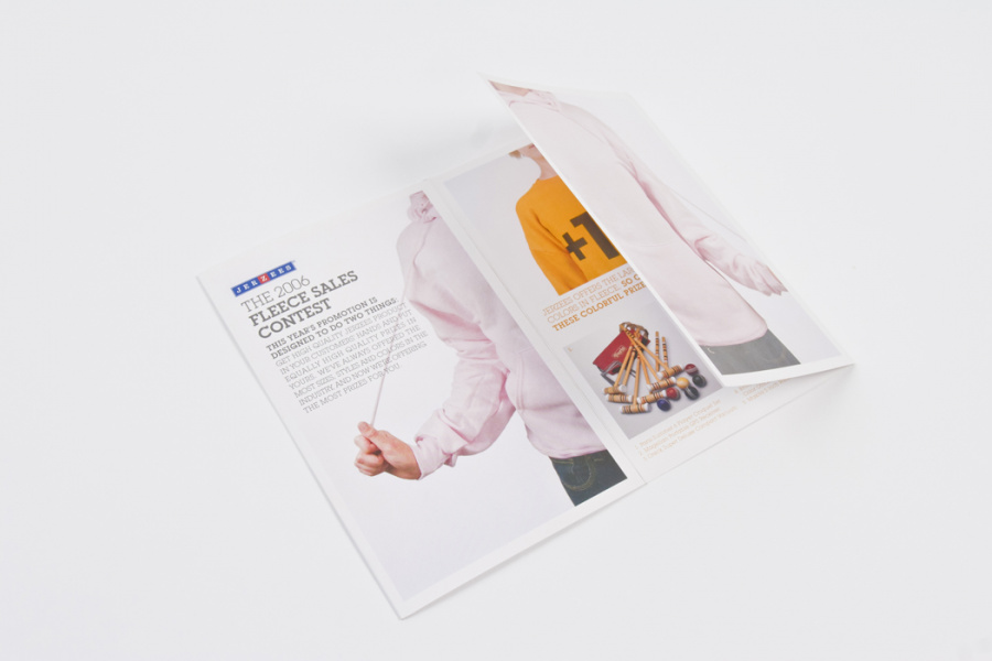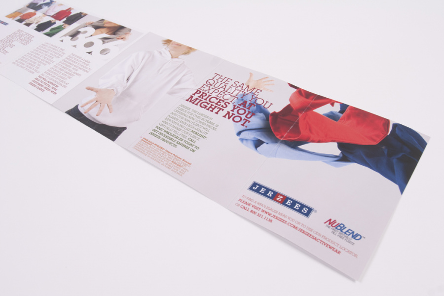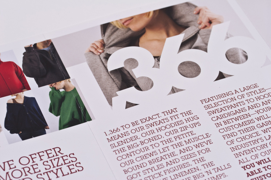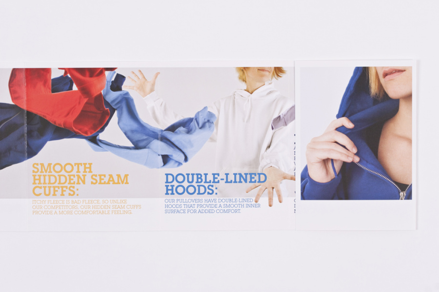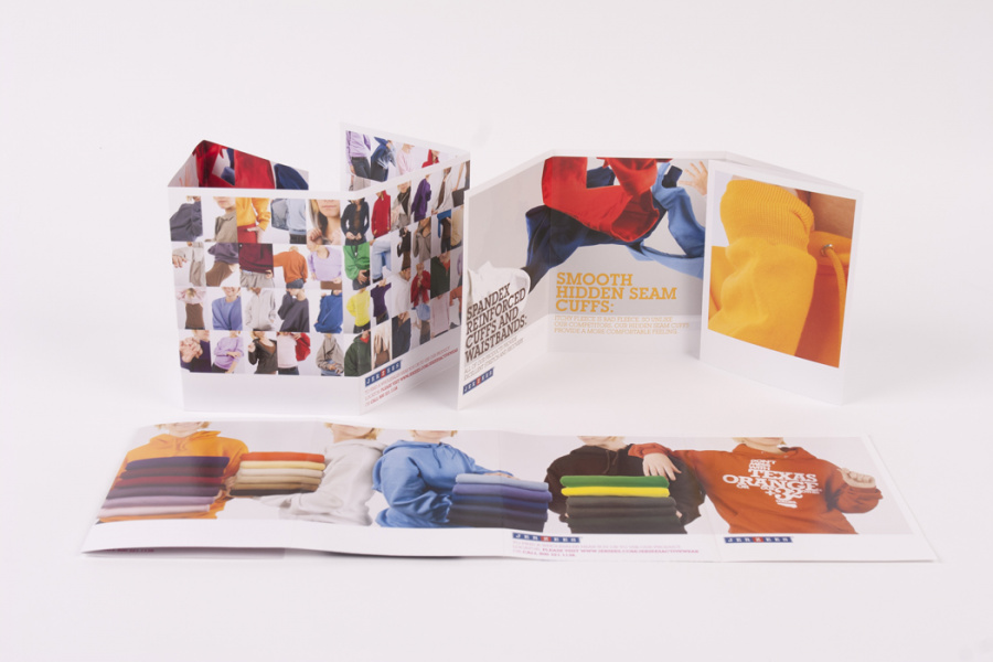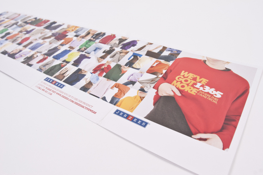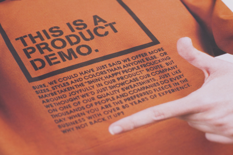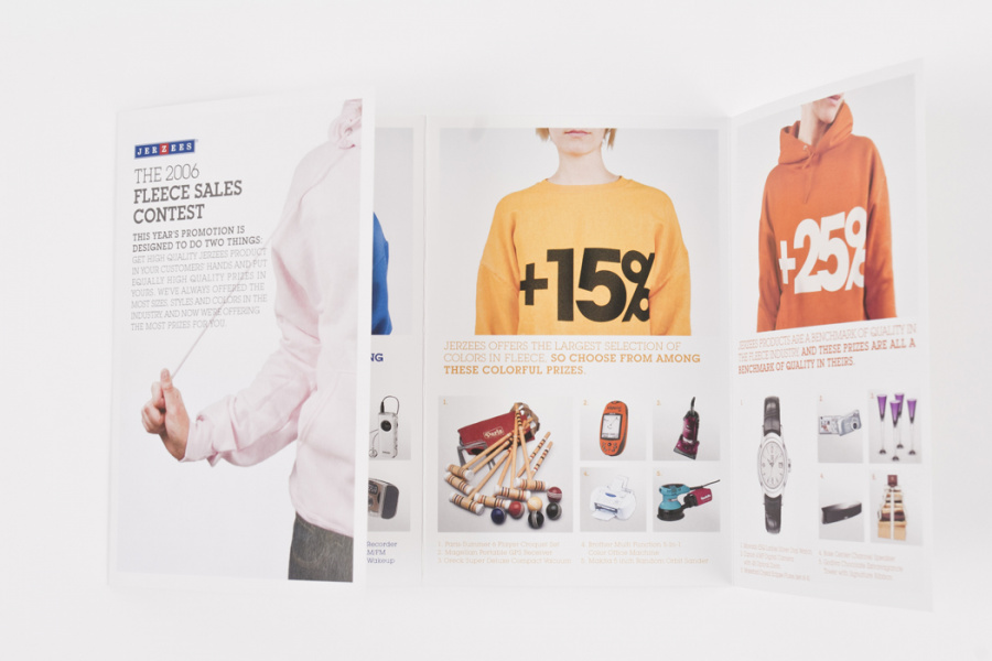 Because Jerzees is the market leader in offering the most sizes, styles and colors, it was important that our campaign concept clearly convey these message points to embellishers, but in a way that would stand out among competing brands. After exploring several different concepts, we realized that sometimes the most effective way to show what a product does is to show exactly what the product does. We recognized that the main way that decorators use Jerzees fleece is to print companies’, teams’ and peoples’ logos on them—essentially advertising these brands. Therefore, our concept achieves the same results by literally printing our messaging on a Jerzees fleece that someone is wearing. Each execution highlights the main benefits of Jerzees products (the industry’s most sizes, styles and colors) while showing how well people can print on the product. It’s a bold, unique, overt way to show decorators and distributors what separates Jerzees from other companies.