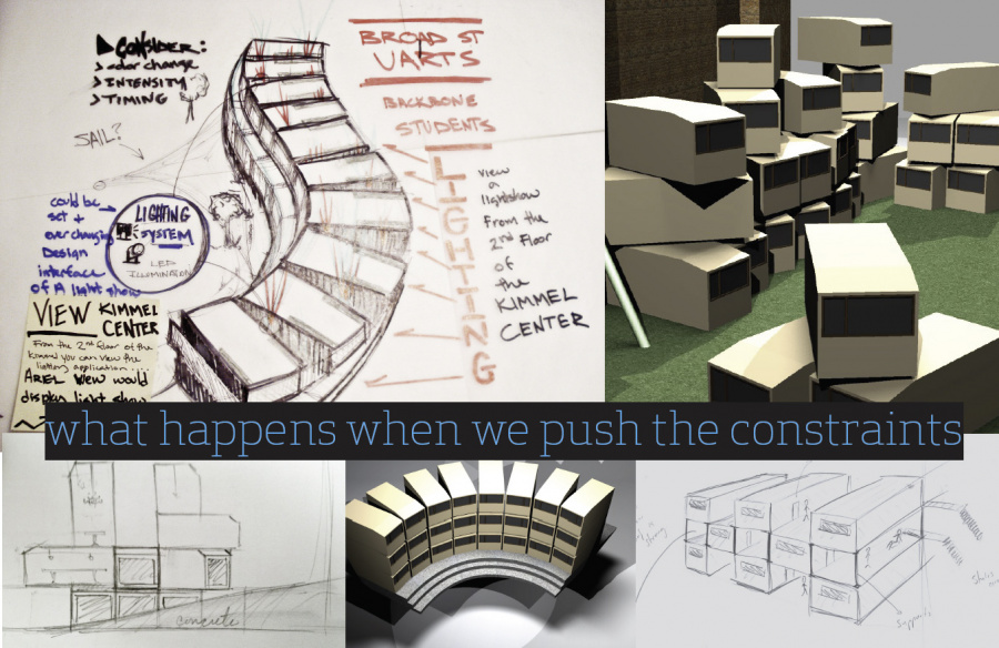 In a 6 week experiment, the various design disciplines at the University of the Arts decided to come together for a series of projects called StudioNext. During this time, teams consisting of Industrial, Multimedia, and Graduate design students tackled various problems with real world clients. My team was anointed Spacebox, a modular housing unit popular in Europe trying to find it’s way here. We were given a large space on campus to work with. A fullscale unit to play around in. And 6 weeks to generate concepts for a very public installation of Spacebox on the University campus.