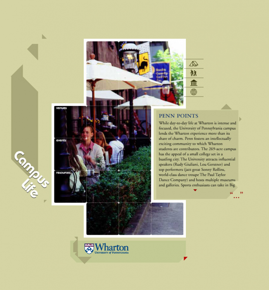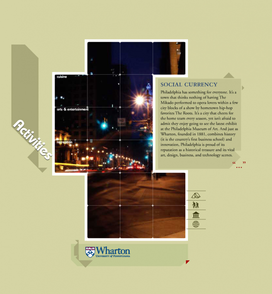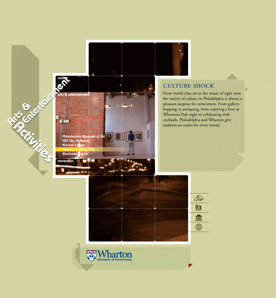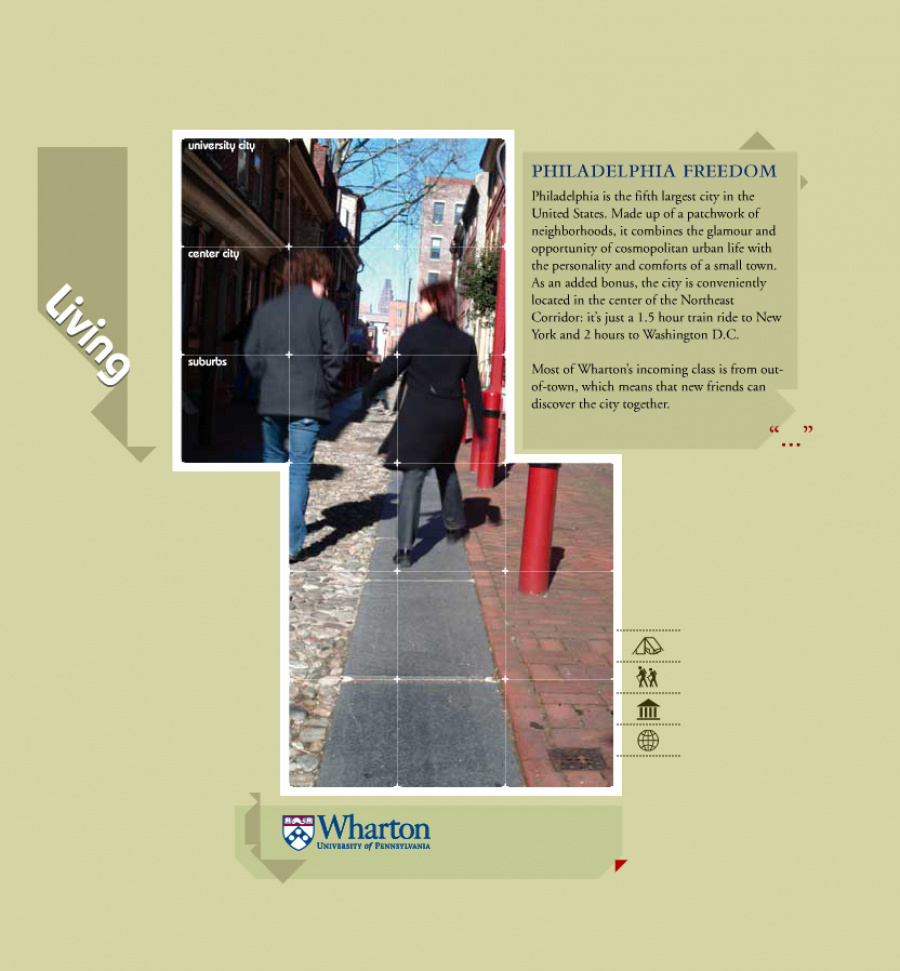 There was a time, not too long ago before hipsters could spread their “blessings” on something via the internet, when schools had to work a little bit harder to convince hopeful applicants, that not only is their program award-winning, but our urban campus is nil too shabby either. This time included the over-indulgent use of a product formerly of Macromedia’s Flash. Lots of “digital” photography, and a little bit of local flair. With the Wharton microsite, we were tasked not with the many offerings of Wharton. I mean, come on. It’s Wharton. But rather, how to show Philadelphia as a blossoming, urban playground snuggled inexpensively between the likes of Washington DC and NYC. The design itself took a map-like interface, quadranting off the 4 key areas of focus, Living, Playing, Working and General Life on campus. The copy was light, instead trying to highlight the City of Brotherly Love as an animated, energetic urban utopia. We sold the idea of “living photography” as a backdrop, and found a blossoming digital photographer form Philly in John Barone. I recall not being able to tell him exactly how many photos we needed cause, well, we were going to use them to make a sort of stop-motion video online. Amazed at this possibility, he simply rented himself out to us for two days, and a whole lot of fun roaming the city.
