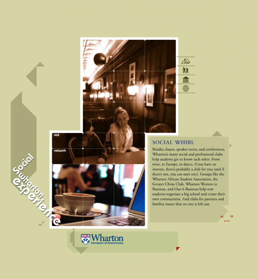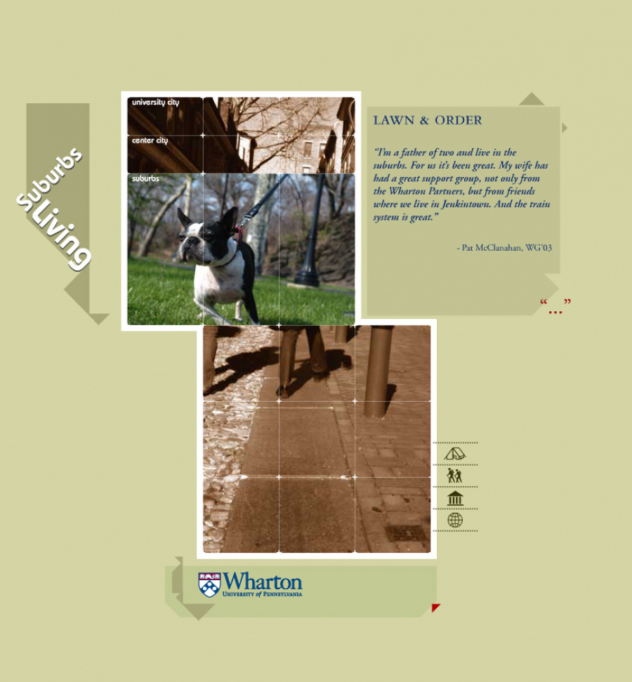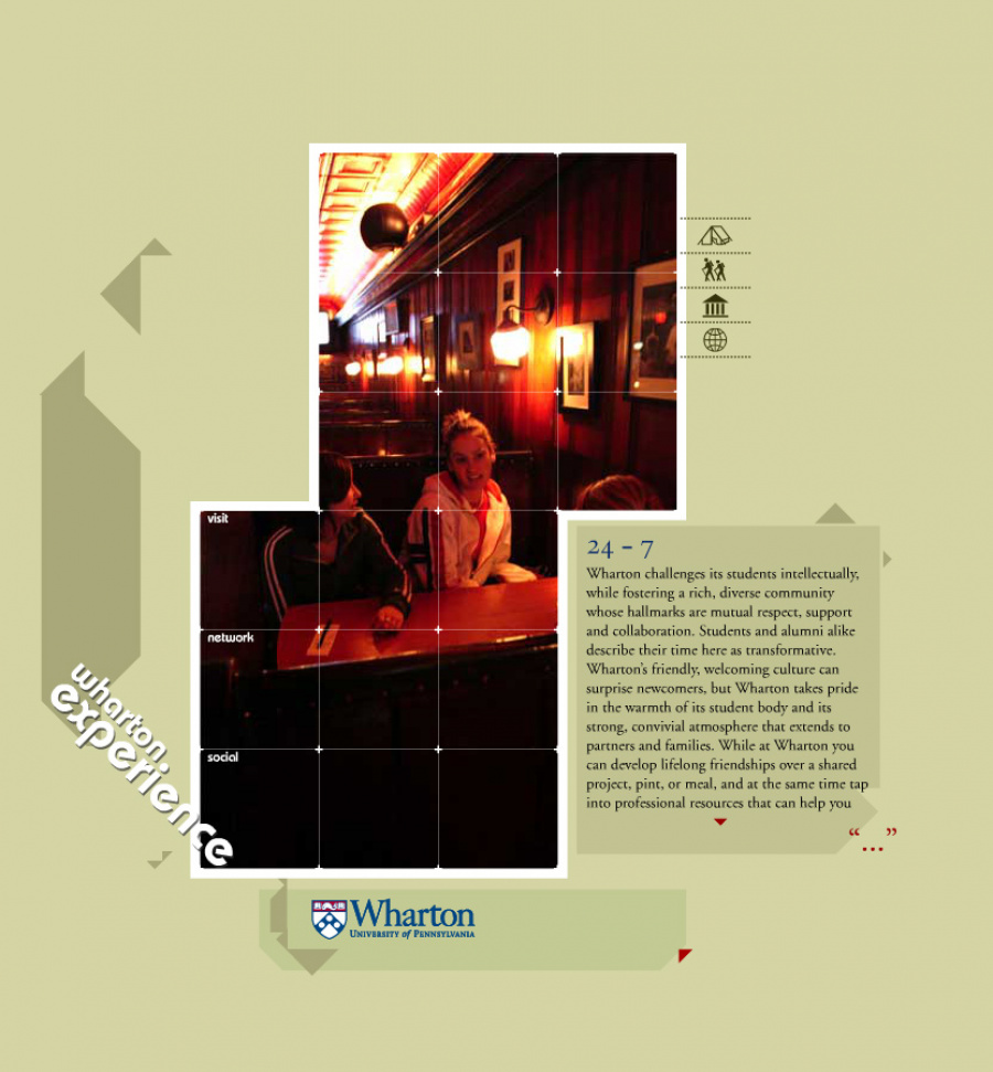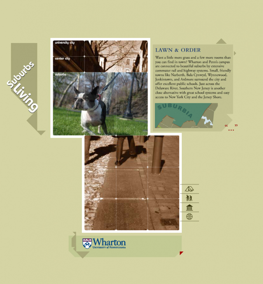 There was a time, not too long ago before hipsters could spread their “blessings” on something via the internet, when schools had to work a little bit harder to convince hopeful applicants, that not only is their program award-winning, but our urban campus is nil too shabby either. This time included the over-indulgent use of a product formerly of Macromedia’s Flash. Lots of “digital” photography, and a little bit of local flair. With the Wharton microsite, we were tasked not with the many offerings of Wharton. I mean, come on. It’s Wharton. But rather, how to show Philadelphia as a blossoming, urban playground snuggled inexpensively between the likes of Washington DC and NYC. The design itself took a map-like interface, quadranting off the 4 key areas of focus, Living, Playing, Working and General Life on campus. The copy was light, instead trying to highlight the City of Brotherly Love as an animated, energetic urban utopia. We sold the idea of “living photography” as a backdrop, and found a blossoming digital photographer form Philly in John Barone. I recall not being able to tell him exactly how many photos we needed cause, well, we were going to use them to make a sort of stop-motion video online. Amazed at this possibility, he simply rented himself out to us for two days, and a whole lot of fun roaming the city.